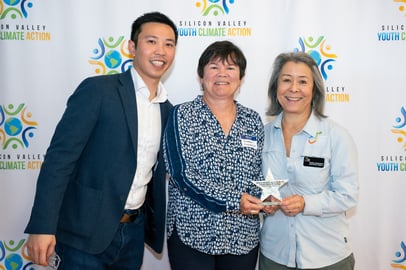 Nature Leader of the Year General Manager Andrea Mackenzie and Board Chair Kathy Sutherland accept the “Nature Leader of the Year” award on behalf of the Open Space Authority alongside Silicon Valley Youth Climate Action Executive Director Zekun Li at the inaugural Youth Climate Honors Celebration.